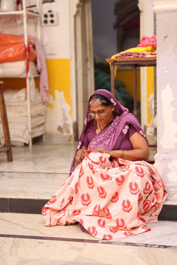 Our slow fashion garments are handcrafted by artisan communities in India, supporting women's empowerment and preserving ancient textile traditions.