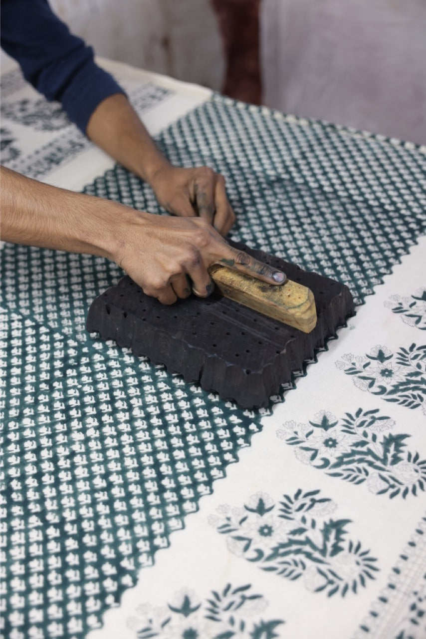 The Rooh Maxi Dress in Pine truly romanticises the magic inherent in hand block printed fabric. This captivating floor length style neatly finished with a bottom tier ensures a perfectly flowing feminine silhouette in gorgeous colours of pine green on a cream base. Featuring delicately extravagant blouson sleeves with an elasticated cuff, a sweet front tie, and midi length cotton underlining.